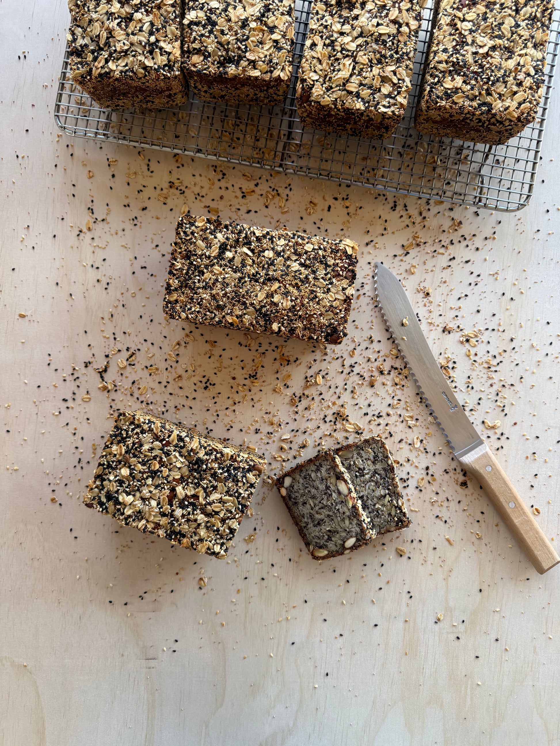 A compact yeast free, flour free loaf that’s a delicious, nutritious alternative to our sourdoughs. Made with honey, almonds and oats, and a mix of seeds including hemp, pumpkin, linseed, chia, sesame and sunflower, plus psyllium husk, sea salt and olive oil.